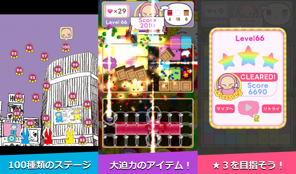アイテムを駆使してクリアを目指そう!クリア時のスコアに応じて星を獲得でき、星は最大3つ獲得可能。全ステージで星3つを目指してみよう!