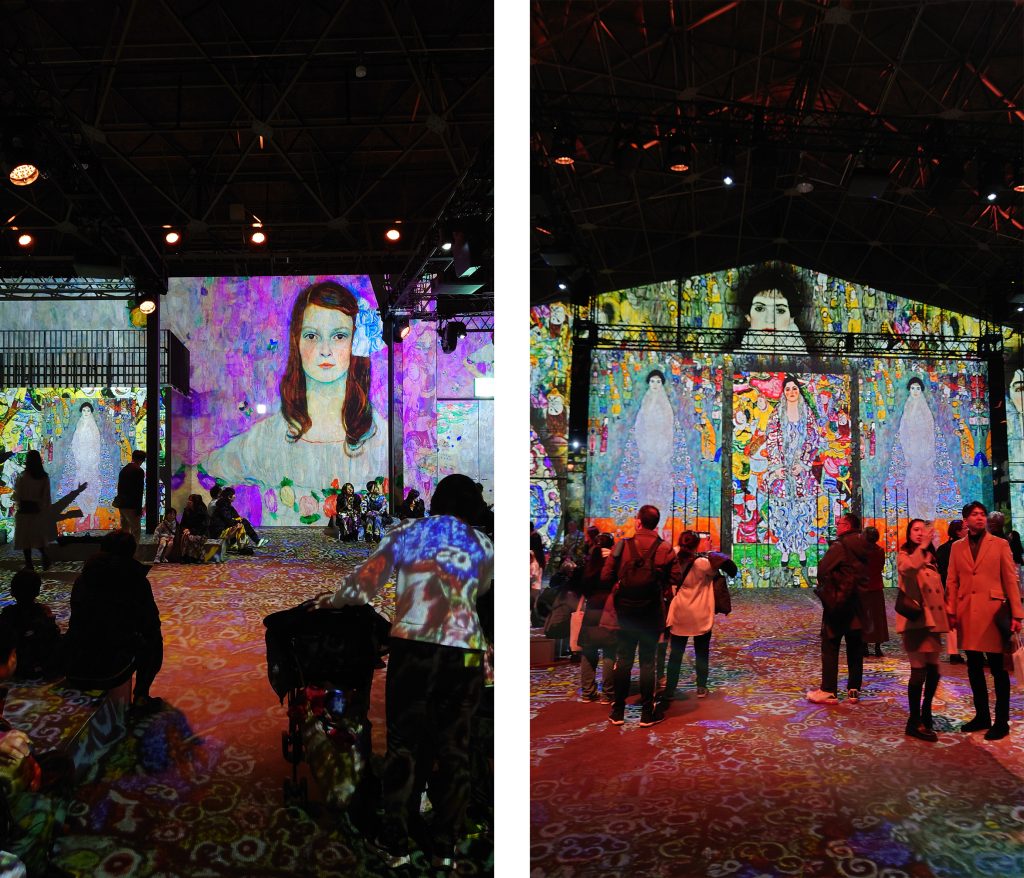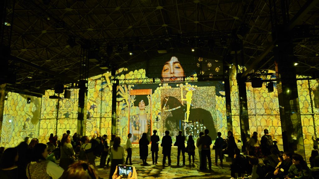 会場に入ると、壁一面、さらには床にまでクリムトやシーレの絵画がプロジェクションマッピングで映し出されており、まさに「名画の中に自分が入り込む」という感覚を味わえます。