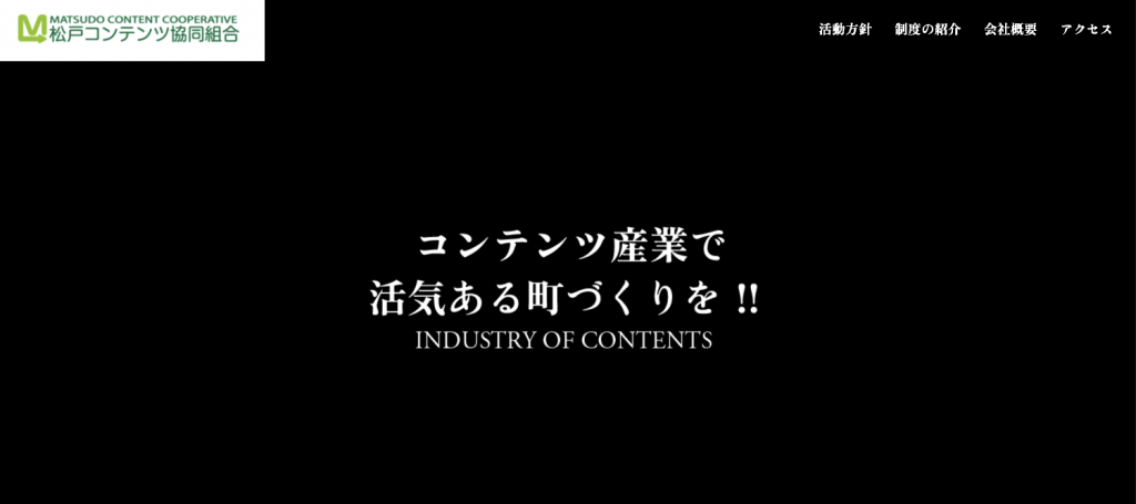松戸コンテンツ協同組合は、組合員の現代ビジネスヘの体質強化や転換を進め、多種多様な案件に対応できるように柔軟性を持って事業を展開していくことを目指します。 また地方自治体などの公的機関と民間企業が連携し、良質なコンテンツを供給・活用・定着させていくことが地域の活性化につながると考え、様々な活動を通じて豊かな街づくりに貢献していきます。